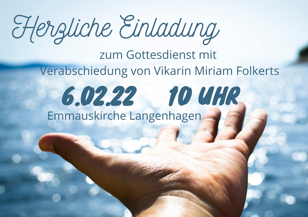 Miriam Folkerts hat zweieinhalb Jahre ihr Vikariat in unserer Gemeinde absolviert und nun das zweite Examen erfolgreich abgeschlossen. Bald tritt sie ihre erste Pfarrstelle an und wird ordiniert. Wir freuen uns sehr, dass sie das alles so gut gemeistert hat und wollen sie in dem Gottesdienst am 6. Februar verabschieden.